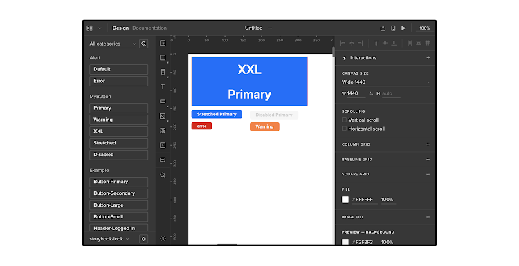 そこで、UXPin のこちらのStorybook統合ドキュメントに従って、私のコンポーネントをUXPinエディタに統合することができました。その後、(さらにコンポーネントがあれば)統合されたStorybookコンポーネントライブラリを活用して、リアルタイムのコードがある環境で、すべてのコンポーネントのインタラクションと機能を使用できる状態で、プロトタイプの作成を開始することができました。